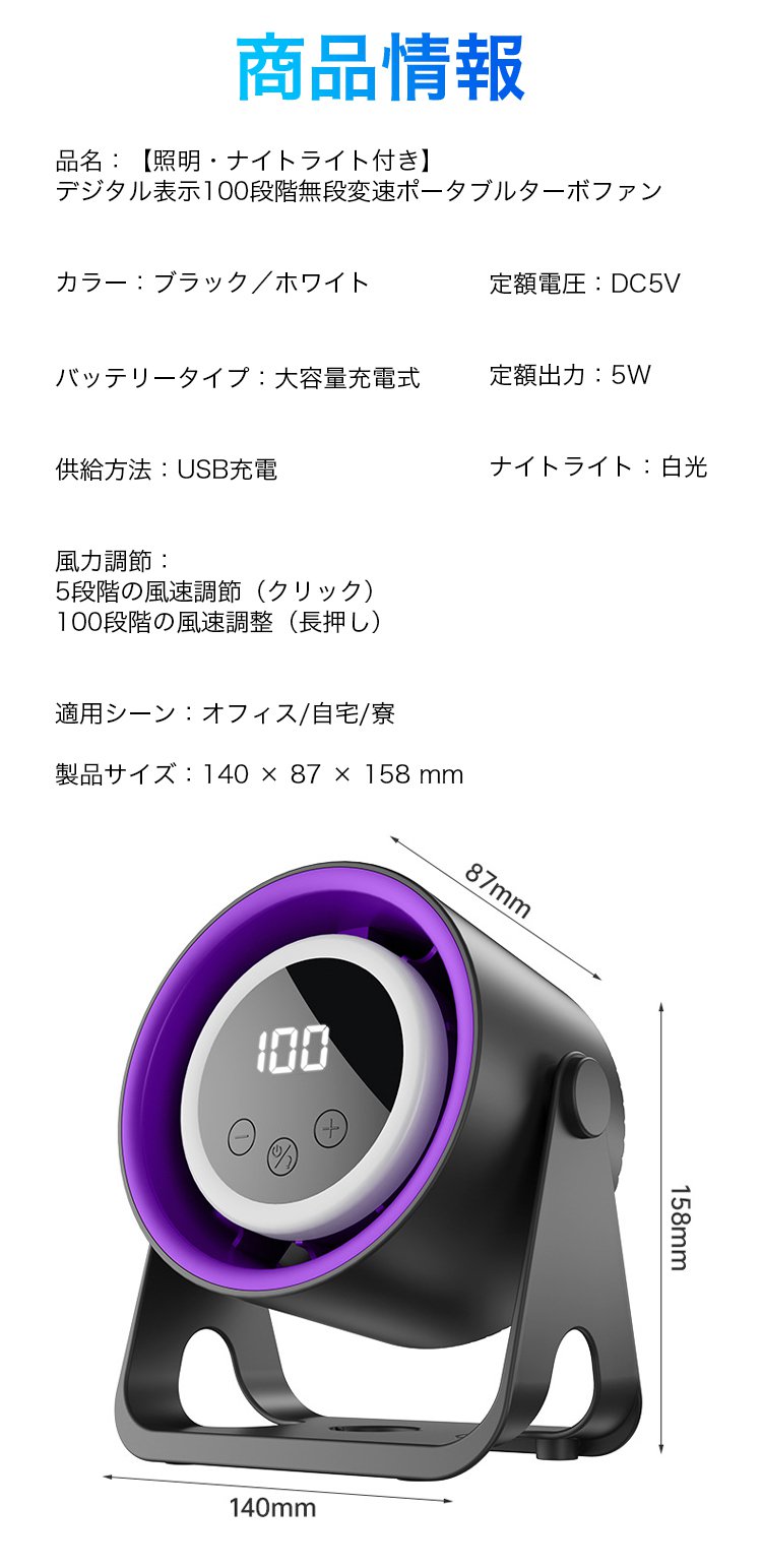【照明・ナイトライト付き】デジタル表示100段階無段階変速ポータブルターボファン